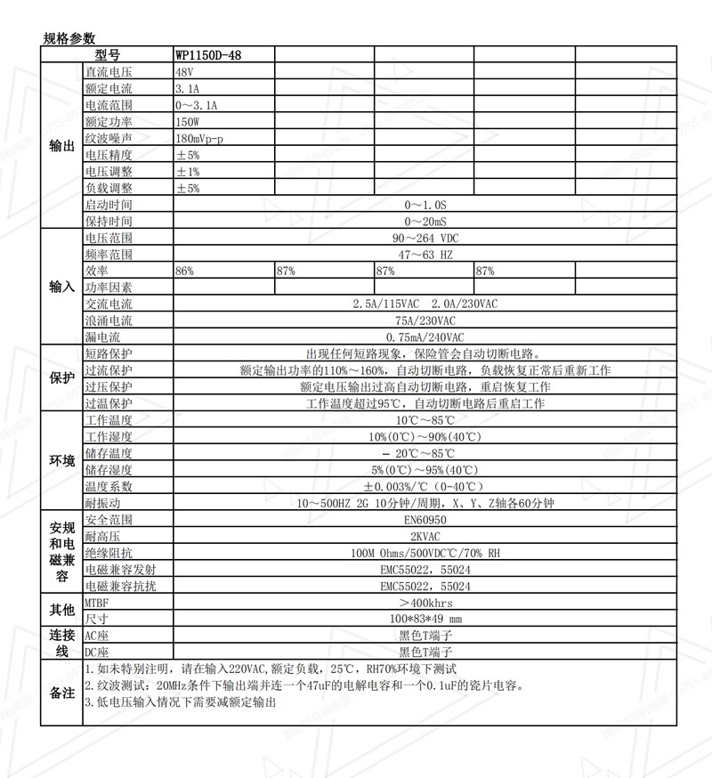 名稱:48V3.1A導軌電源_150W導軌電源型號:WP1150D-48規格參數: